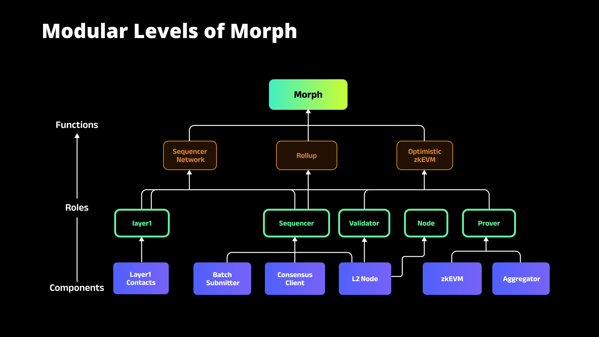 Morph 有三个重要模块,各个角色各司其职,保证模块无缝运行,每个角色由不同的组件组成。这些底层组件有效地相互协作,同时保留各自的主权。三个模块分别是:负责共识与执行的 Sequencer Network;负责结算的 Optimistic zkEVM;负责数据可用性的 Rollup。