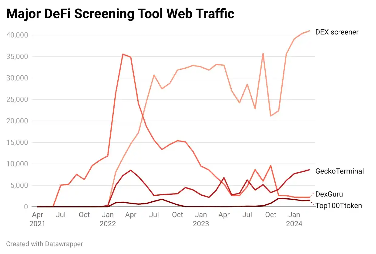 由于每天都有许多代币上市,拥有一款能够一目了然地查看和分析它们的工具至关重要。目前,DEX screener 在网络流量上占据主导地位,而 DexGuru 自 2022 年初达到峰值以来一直呈下降趋势。