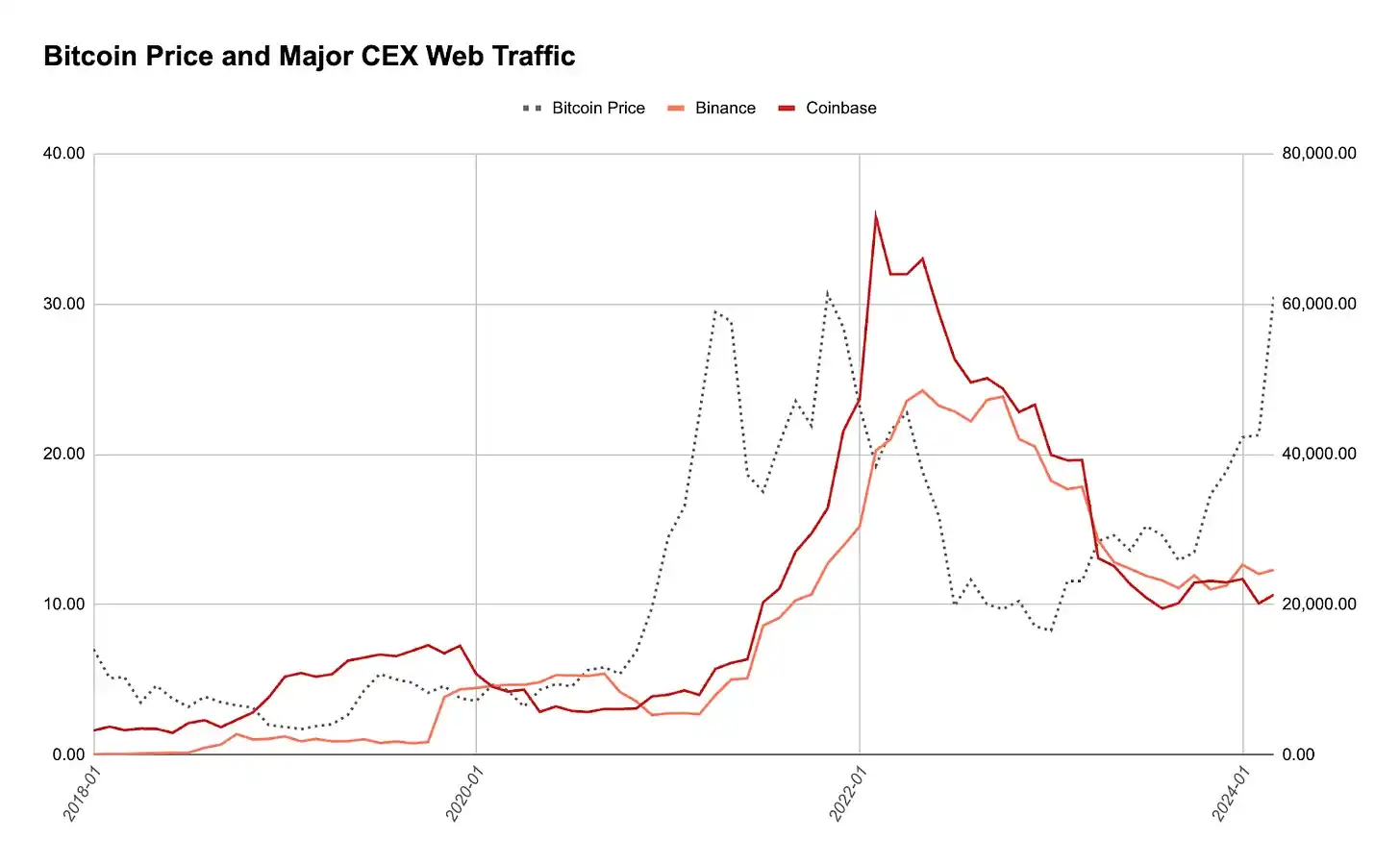 比较比特币价格和交易量与每个交易所的网络流量进一步说明了与过去繁荣期的差异。比特币价格大幅上涨,而交易量和交易所网络流量保持低位,这表明影响价格上涨的可能是 ETF 等加密货币交易所之外的交易。