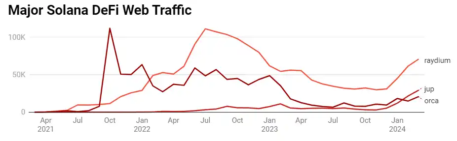 · DeFi 分析工具和 DeFi 网络流量的差异:尽管像 DEX 筛选器这样的分析工具的流量稳步增长,但传统的 DeFi 服务的网络流量相对较低。这表明投资者在做出实际交易或投资决策时更具选择性,而不是经常访问分析工具以获取市场信息。