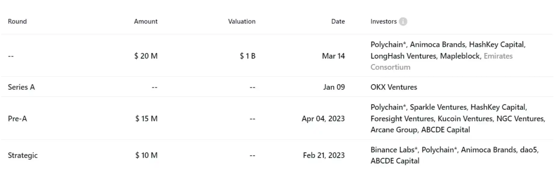 23 年 2 月为第一轮融资,获得了由 Binance Lab 和 Polychain 共同领投的 1 千万美金。