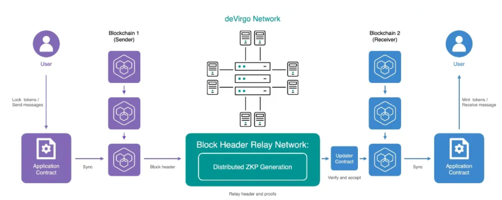 zkBridge 作为 Polyhedra Network 的核心产品,它被设计为一个无需信任的跨链桥。zkBridge 使用 zkSNARK 使证明者能够有效地让接收的链确认发送者链上发生了某种状态转换。它由区块头中继网络和更新合约组成。通过模块化设计,zkBridge 实现了几项有用的功能,包括消息传递、代币转移以及在不同链上的状态变化上运行的其他计算逻辑。
