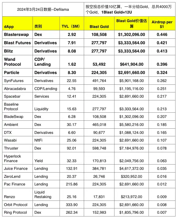 我们从 Defilama 上对照一下这些项目的 TVL 和 Blast Gold 的获得数量,可以估算出一个性价比排行。