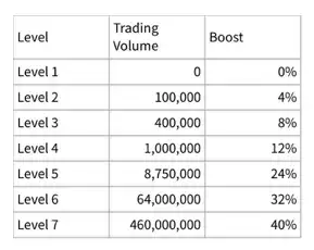 交易奖励:用户在平台的交易量会被记录下来,$100 等值的交易量可以获得 15 分,达到$1000 可以获得 200 分,达到$10000 可以获得 3000 分。
