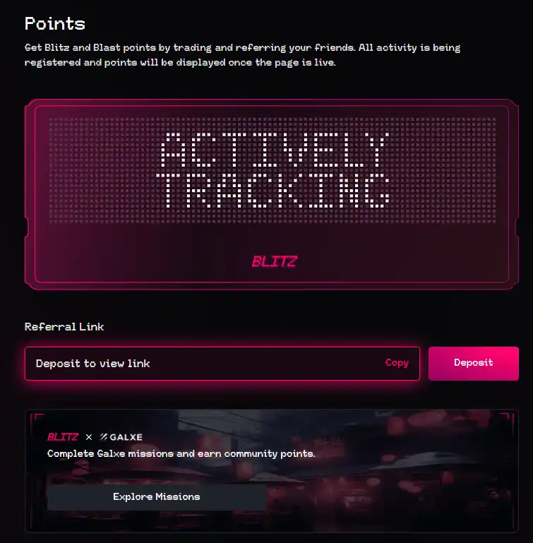 根据网页上的提示,目前的积分显示并未上线,具体的规则也尚未公布,但可以猜测得到的是,想要获得 Blitz 的积分,应该也是需要对流动性和交易量做出贡献。另外,Blitz 在 Galxe 上的活动仍然在进行中,可以通过活动获得 Blitz Community Points,具体的规则参考官方说明:https://docs.blitz.exchange/points-and-protocol-rewards/blitz-community-points
