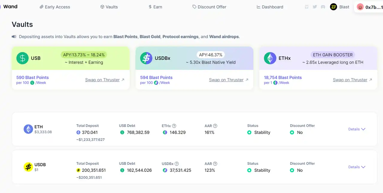 这个创新提高了用户的学习门槛,所以还没有大规模资金涌入,目前 Wand 协议的 TVL 为$1.6M。协议开了两个池子,分别是 ETH 和 USDB,都是 Blast 的原生带息 Token,用户可以将 ETH 或者是 USDB 存入 Vault 中,借贷出协议稳定币$USB,同时还可以获得$ETHx 和$USDBx。$ETHx 相当于是 ETH 的杠杆代币,而$USDBx 则是将 USDB 的收益放大数倍的权益代币。