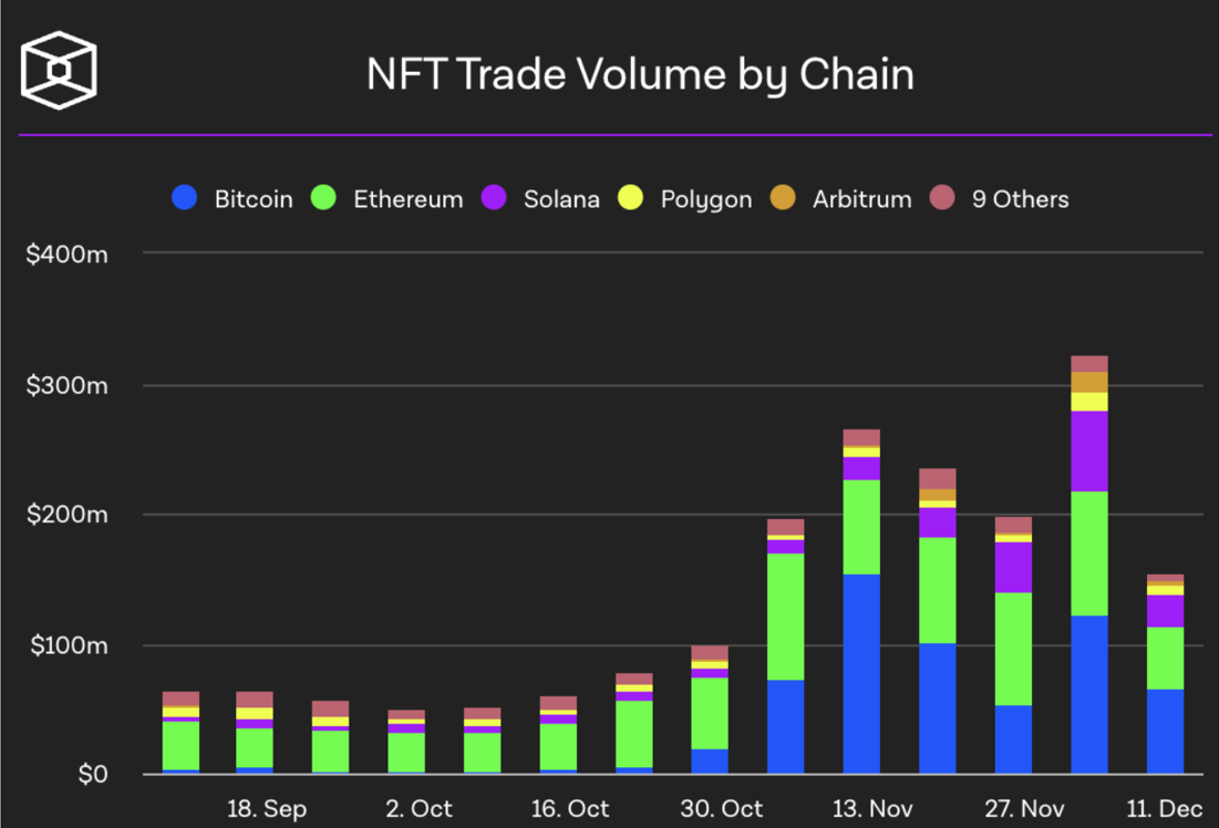 截至 2023 年,Ordinals 的飞速发展让没有智能合约比特币成为了最主要的 NFT 平台之一,其地位甚至超越了支持智能合约的 Solana。特别是在 11 月,比特币 NFT(Ordinals)的销量实现了惊人的500%[2]增长,超越了同期的以太坊和 Solana。尽管 Ordinals 仅诞生不足一年,但在比特币上部署的资产受益于网络的不可篡改性和持久性,其价值已经得到了显著的提升。
