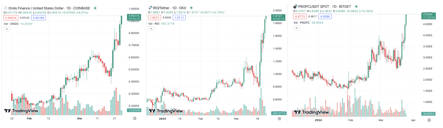 专注于 RWA 的发行和管理的 Layer1 网络 Realio Network 代币 RIO 也紧跟其上,近一周涨幅 108%。房地产代币投资市场 Propchain 代币 PROPC 近一周涨幅 61.9%,24 小时涨幅 29.1%。
