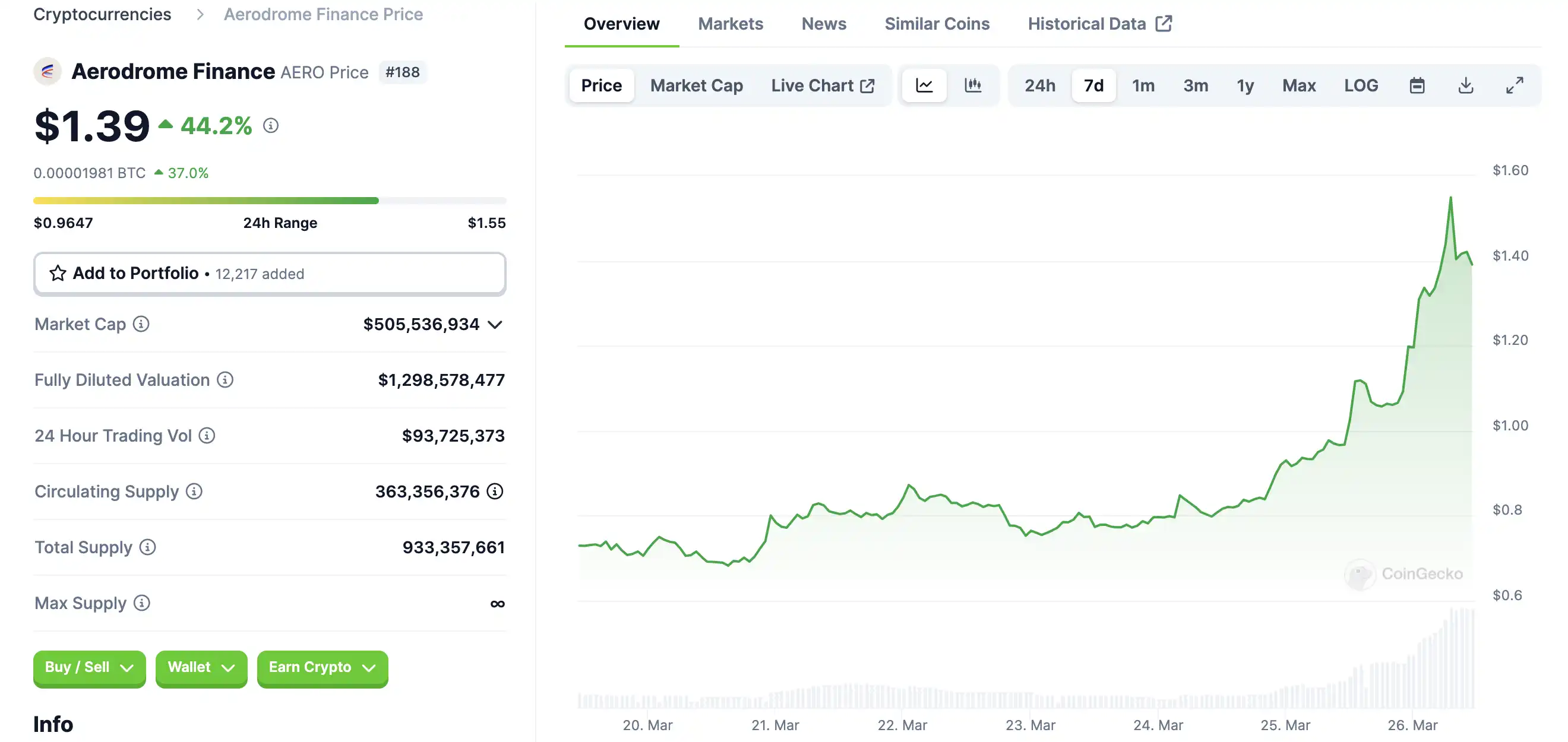 而 Base 生态除了 meme 币 DEGEN,还有一个「正儿八经」的 DeFi 项目代币 AERO,截止撰稿时,其价格为 1.4 美元,7 日涨幅达 93%。
