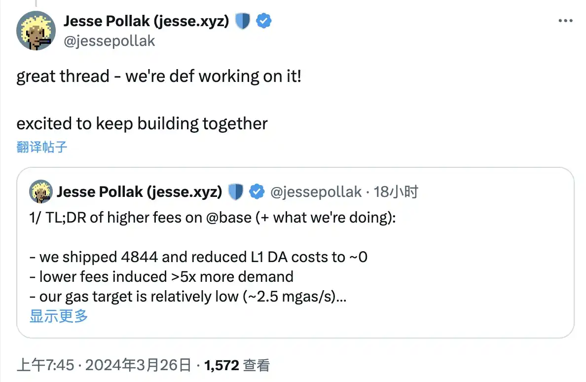 Base 负责人 Jesse Pollak 亦借此解释了为何 Base 在坎昆升级之后 gas 费用不降反增,其表示 EIP-4844 已大幅降低了 Layer 1 层面的 DA 成本,gas 费用本该降低,但由于网络交易需求增长了 5 倍有余,且 Base 网络之上的区块存在 250 gas/s 的限制,需求大于供给使得 gas 费用出现了上涨。
