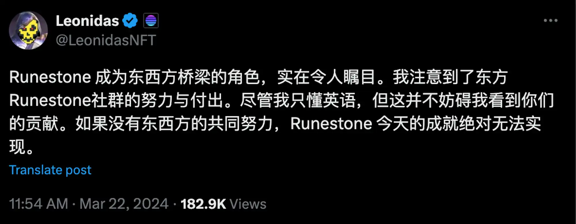 本身的铭文生态可以发展如此迅速的一个重要原因就是公平,而 Runestone 则是从空投开始就叠加了「公平」的特性,「空投」+「公平」+「Runes」的叙事特性,在二级市场 FOMO 情绪中也可以看出来,同时不同于此前的铭文,Runestone 拥有中西方社区用户的共识,而此前的 BRC-20 铭文更多是华语区在玩,Leonidas 也用中文发了推文表示:「Runestone 成为东西方桥梁的角色,实在令人瞩目。我注意到了东方 Runestone 社群的努力与付出。尽管我只懂英语,但这并不妨碍我看到你们的贡献。如果没有东西方的共同努力,Runestone 今天的成就绝对无法实现」。