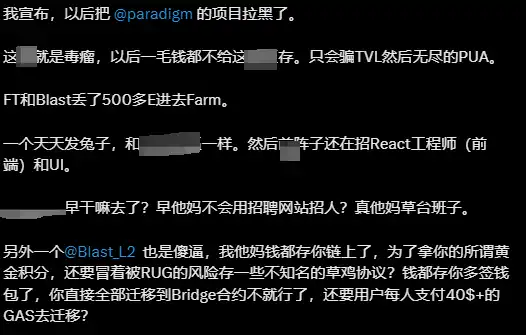 更不用说 Blast 在主网上线后的进一步 PUA 积分策略,让存了不少 ETH 的早期参与者们更加骑虎难下,愤概和生气的情绪一时达到了极点: