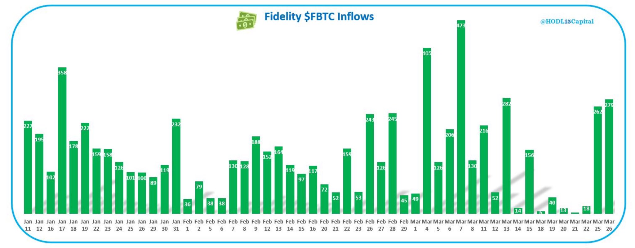 富达(Fidelity)的基金创造了自3月13日以来的最大单日流入量,3月26日达到2.791亿美元--因为这家投资巨头又抢购了4000个比特币。这标志着该基金连续第二天流入资金超过 2.6 亿美元。