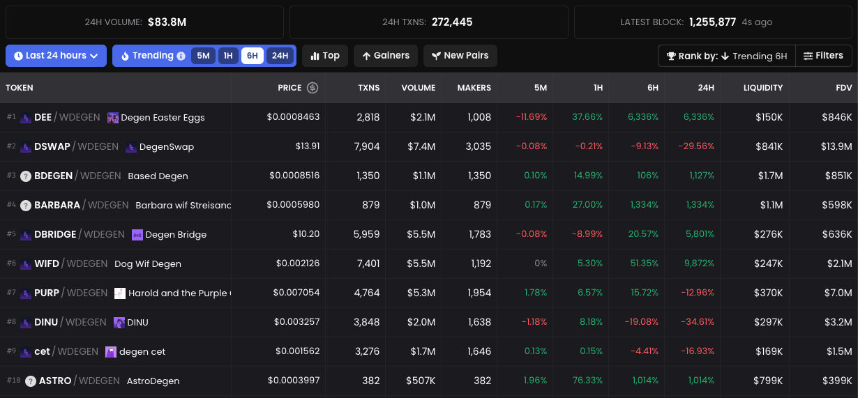 在随后数日,DEGEN 一路冲高,4 月 1 日,DEGEN 短时突破 0.06 美元,较一周前再次实现 3 倍涨幅,随之而来的则是 Degen Chain 生态的炒作热潮。周末,Degen Chain 生态代币普涨,其中 Degen 生态 DEX 平台 DegenSwap 代币 DSWAP 24 小时涨幅 465%,Meme 代币 DINU 24 小时涨幅 194%,PURP 则 6 小时涨幅 67%。根据 Dexscreener 数据,Degen Chain 在上线不到一周的时间,就实现了超 8 千万美元的日交易量,24 小时交易数量达 27 万次。