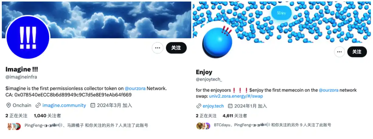 IMAGINE 是 Zora 上第一个无许可的收藏者代币,旨在以经济激励支持和鼓励 Zora 生态内的艺术收藏者和创作者。ENJOY 则是 Zora 上的第一个 meme 代币,三月初由社区空投至符合条件的社区用户,获得第一季空投的条件有前 500 名活跃 Zora 创作者和约 1 万名活跃的 Zora 收藏家,当然,尊贵的 Warpcast OG NFT 持有者也在空投列表中。
