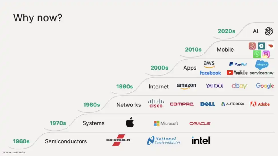 至于为什么认为当下是参与 AI 的重要时点,Pat Grady 提到,红杉从创立以来见证了历史上的数次技术变迁、也受益于此,在这个过程中,团队也对于不同技术浪潮之间如何互相影响、推动世界向前发展有着清晰的认知: