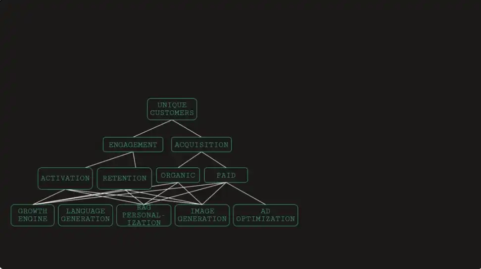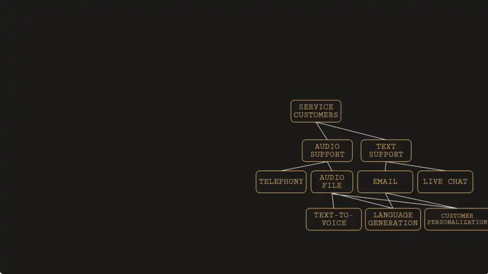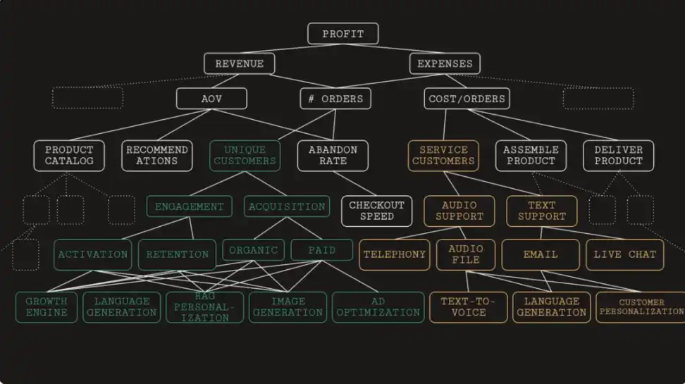 以客户支持流程为例,上图是一个简易客服流程示意图。客服部门有一系列 KPI,这些指标受到文生语音、语言生成、客户个性化等因素的影响,这些因素形成了优化项树状图中的子模式或子树,最终形成一个层次明晰、互相连通的体系图,其中语言生成的反馈将直接影响服务客户的最终 KPI。借助这种抽象方式,整个客服流程将由神经网络管理、优化和改进。