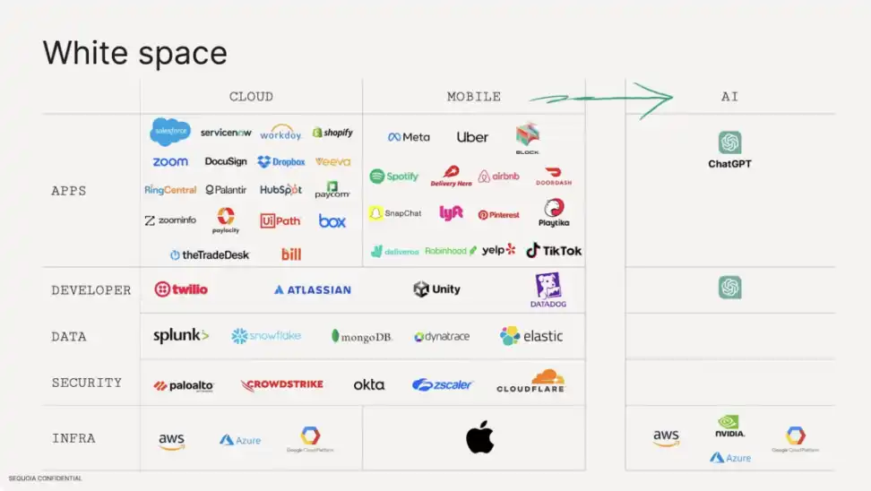 关于 AI 未来的行业格局,Pat Grady 先总结了 Cloud 和 Mobile 时代出现的收入超过 10 亿美元的公司(如上图左侧),虽然 AI 代表的最右侧现在几乎还是空白,但也象征在当前市场中巨大的的潜在价值和机会。Pat Grady 预测,在未来的 10-15 年,右边的空白就会被 40-50 个新的公司 logo 填满,正是让他们感到兴奋的机会所在。