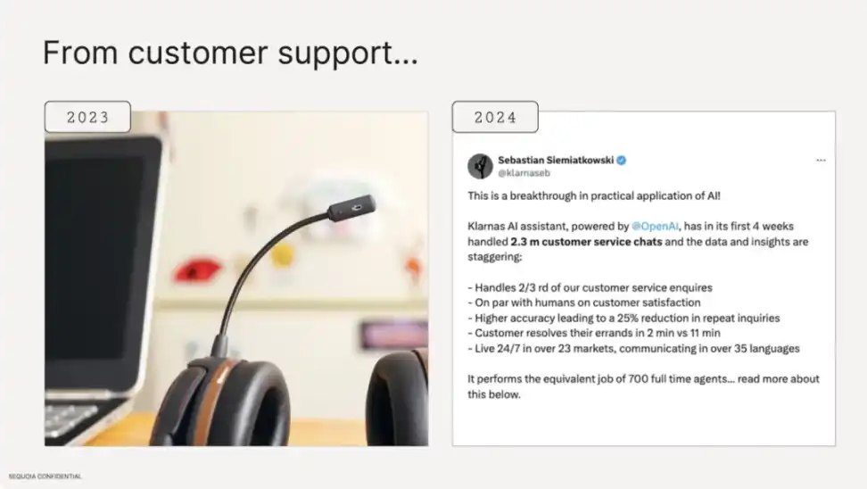 红杉合伙人 Sonya Huang 首先从客户服务、法律、编程和视频生成等领域回顾了过去一年 AI 的发展。