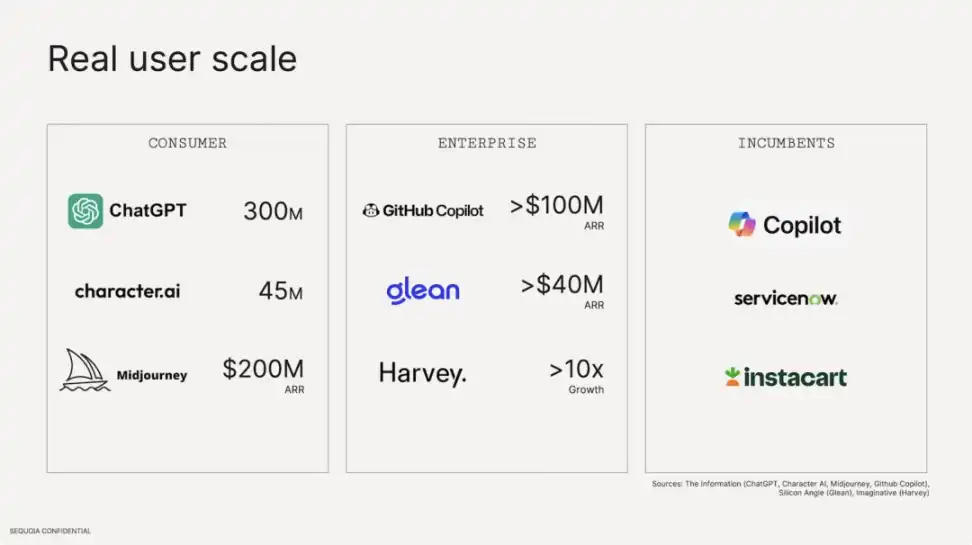 从上图也可以看出,客户对 AI 需求不仅限于一两个应用,而是方方面面的。很多人都知道 ChatGPT 有多少用户,但当在观察许多 AI 应用的收入和使用数据时,会发现现在不管是 to B 还是 to C,初创公司还是已有的科技公司,很多 AI 产品都在各个行业找到了合适的 PMF,应用场景已经非常多样化。