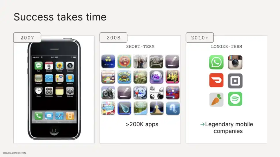 新技术从出现到成熟需要一个过程,开创性应用的出现同样需要时间。以 iPhone 为例,App Store 初期的许多应用都很原始,只是展示新技术,并没有真正解决问题或创造价值。像手电筒或者类似 beer drinking 这种小游戏,后来都变成了系统内置应用或者可有可无的小工具。而 Instagram 和 Doordash 这样真正具有影响力的应用都是在 iPhone 和 App Store 推出几年后才出现的。