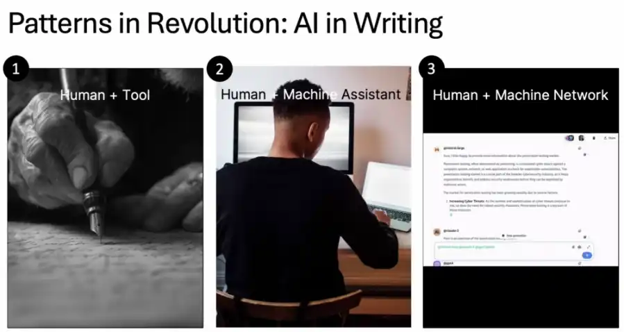 写作曾经也是纯人工的,后来人与机器助手协作,现在已经可以利用很多个工具协同。比如大家现在使用的 AI 助手不仅仅是 GPT-4,还有 Mistral-Large 和 Claude-3 等工具,并且借助他们互相验证,获得更好的答案。