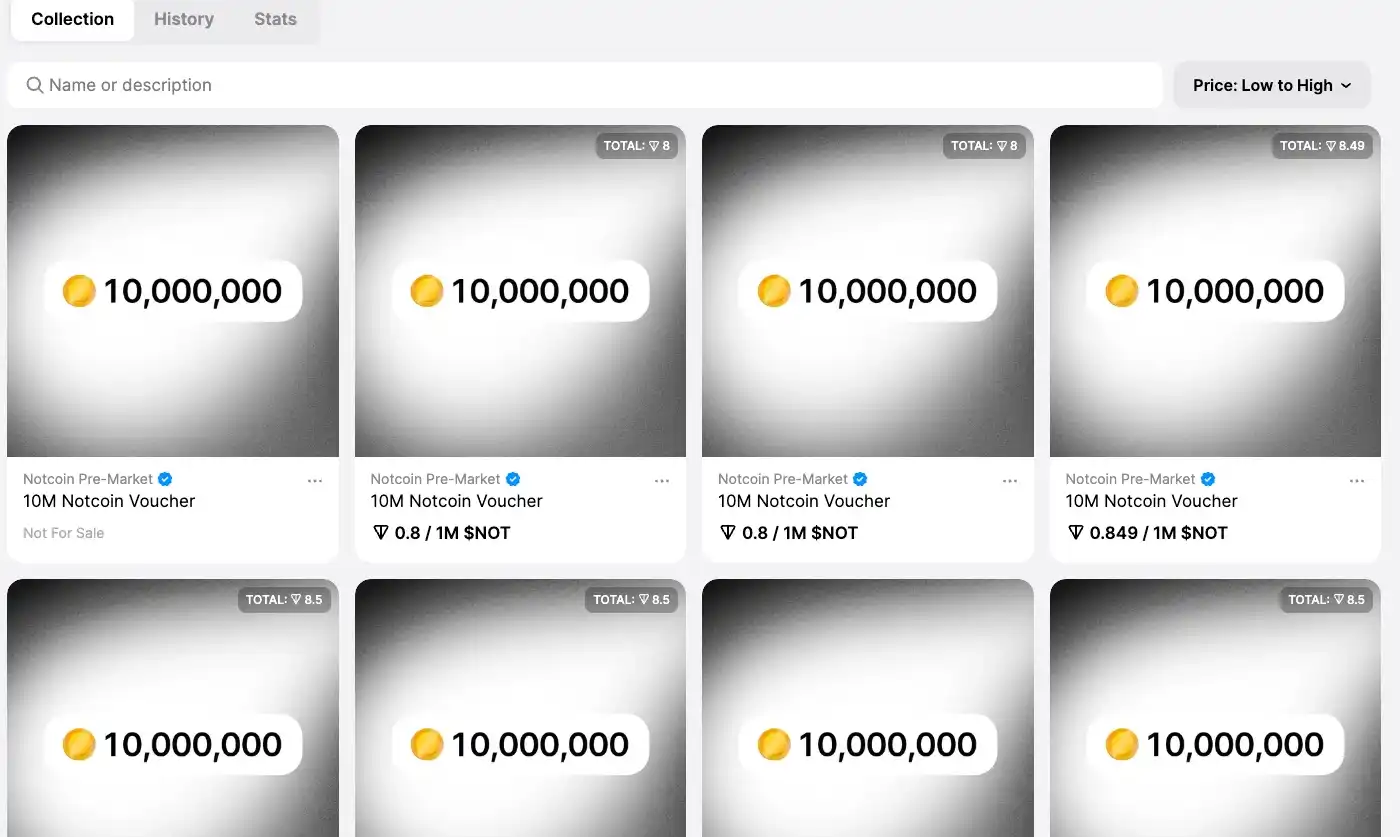 3 月初,Notcoin 推出了一项功能,允许精英玩家将大量游戏内货币转换为 NFT 代金券,这些代金券可以在其代币正式发行之前进行交易。玩家可以选择用 1000 万或 1 亿游戏币换取优惠券 NFT。当前该 NFT 已上线 TON 生态 NFT 交易平台 Getgems 进行提前交易和定价,当代币正式在链上发行后,NFT 可兑换为代币。