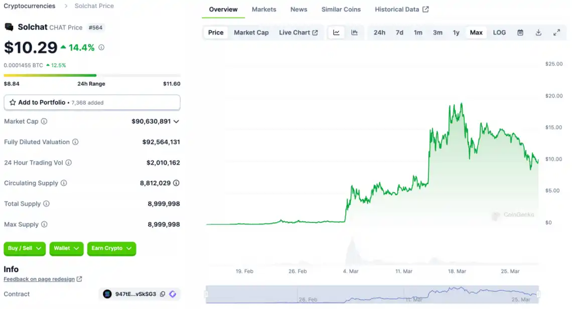CHAT 代币总量为 1000 万枚,50% 用于预售,10% 作为 LP,10% 分配给团队,10% 用于市场营销,10% 用于中心化交易所。当前市值为 9060 万美元。Solchat 引入了一种质押机制,用户可以将其 $CHAT 代币质押到质押池中,以获得总池中 80% 的收入份额。