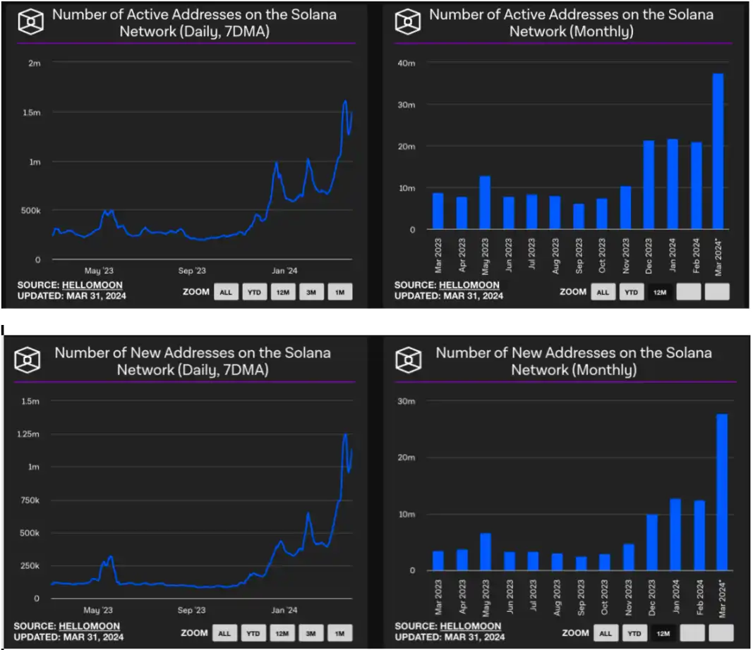 当前 Solana 的 TVL 为 49.9 亿美元,生态处在迅速恢复的阶段。距离上一次牛市的 TVL 高点 100 亿美元仅一步之遥。链日活跃用户和新增地址数量自 2022 年 5 月以来持续创下新高。自 2024 年 3 月活跃地址数量为 3743 个,新增地址数为 2784 个。
