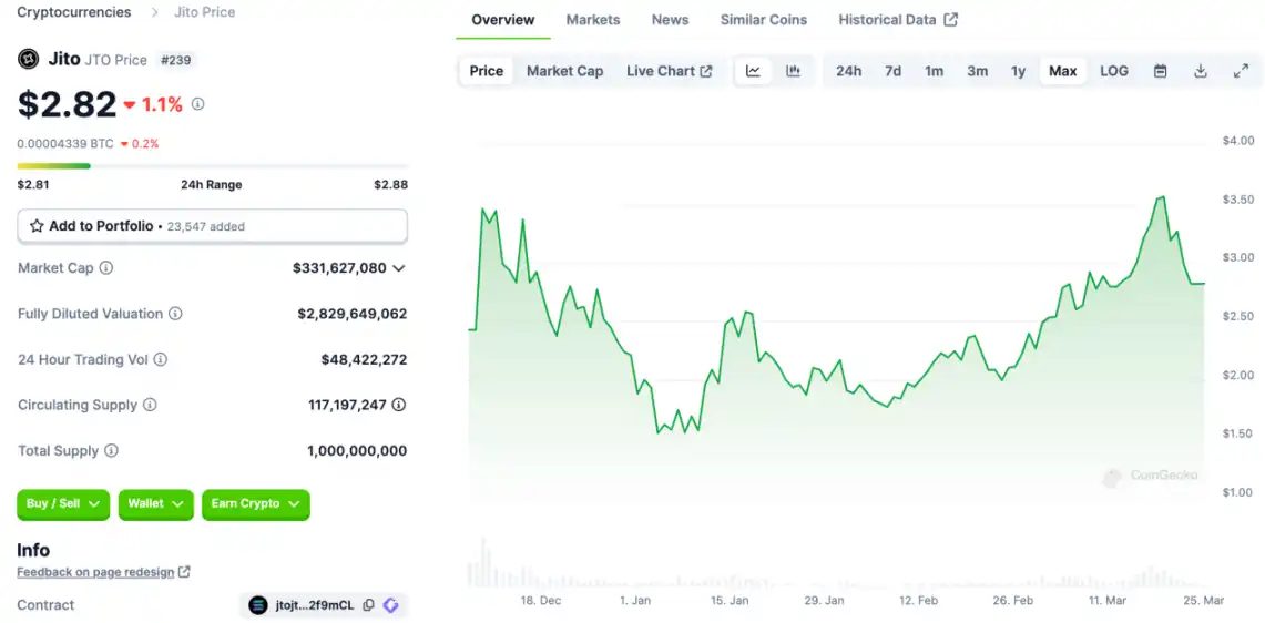 Jito 的原生代币为 JTO,当前流通市值为 3.31 亿美元,于 2023 年 12 月 7 日正式发行,总供应量为 10 亿枚,当前流通量为 11.7%,主要交易场所为币安。代币总量中 34.3% 用于社区增长;24.5% 分配给核心贡献者;25% 用于生态发展;16.2% 分配给投资者。分配给社区增长的代币中 1 亿枚用于空投,8,000 万枚分配给了 JitoSOL 的持有者,1,500 万枚分配给运行 Jito 客户端的验证者,500 万枚用于分配给 Jito MEV 的搜索者。
