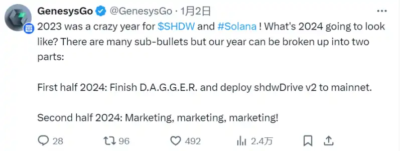 而且 GenesysGo 官方曾在 X 平台直言 2024 年上半年的任务就是将 ShadowDrive V2 和 D.A.G.G.E.R 部署到主网,下半年的任务则是营销、营销、营销。
