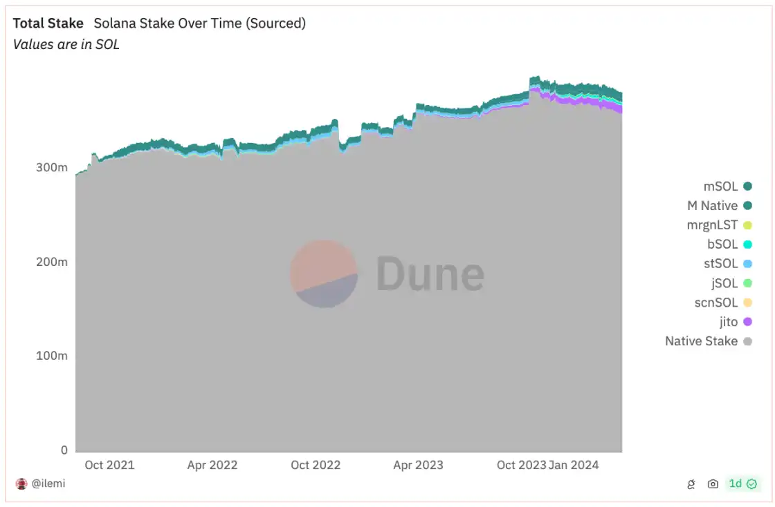 SOL 质押数量在 2023 年 10 月 30 日达到了历史高峰,为 3.98 亿枚。由于币价拉升,因此部分代币选择解质押,目前,Solana 共质押了 3.8 亿枚 SOL,其中越 3.57 亿枚为直接通过节点质押,2300 万枚 SOL 则是通过流动性质押协议进行质押。其中生态上最大三个流动性质押协议为 Marinade Finance、Jito Network 和 Blazestake。