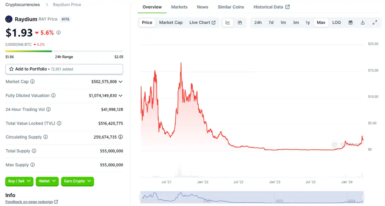 RAY 代币总量 5.55 亿,于 2021 年 2 月 21 日推出。当前市值 5 亿美金,FDV 为 10.7 亿美金,代币流通量达到 46.7%。在 RAY 经济模型中,有 22% 代币分配给了团队和顾问,据悉该部分代币至少有 3 年锁定期,也就意味着 2024 年团队部分代币可能面临解锁。