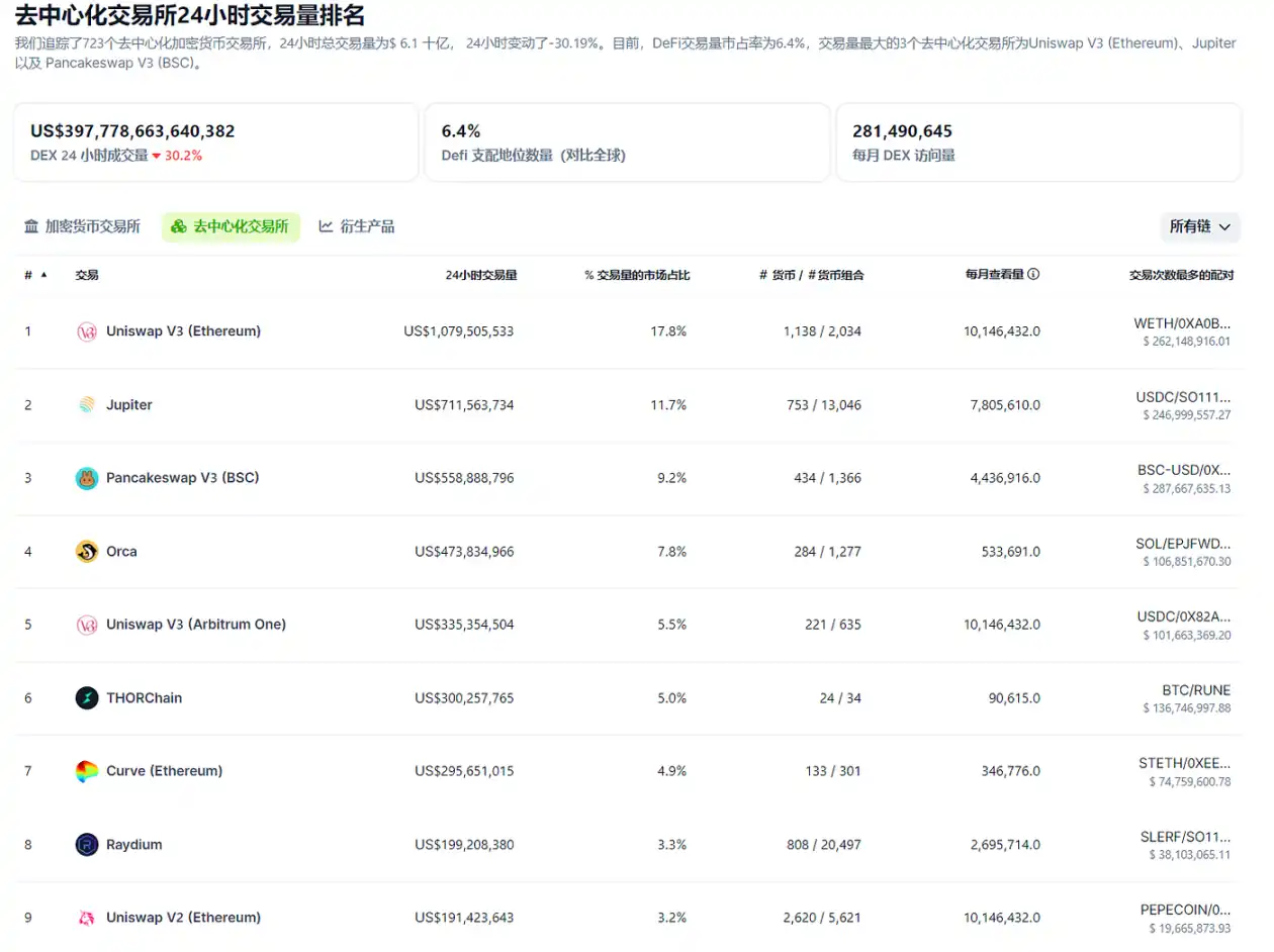 依据 Coingecko 去中心化交易所交易量排名来看,Jupiter 24 小时交易量仅低于 Uniswap,占据第二名,并在近期几度超越 Uniswap。一方面是由于 Solana 生态的火热,交易量异常活跃,另一方面则因其良好的流动性,Jupiter 目前已成为 Solana 用户交易首选。