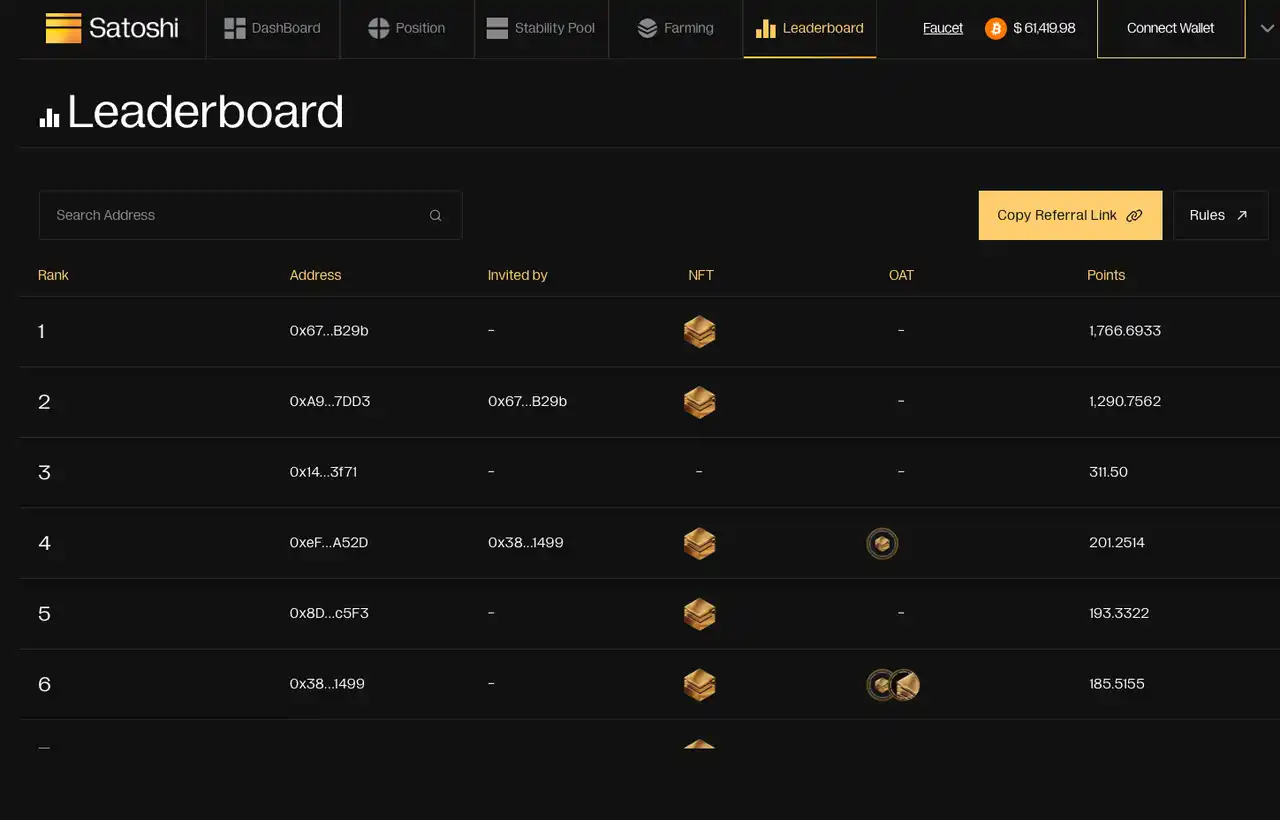 Satoshi Protocol 将在主网启动后设置积分 Leaderboard 和邀请活动。用户可在活动期间通过借出 SAT 获得 Position Points,也可通过邀请他人借出 SAT 活动 Referral Points。用户将根据两种积分的总和在 Leaderboard 上获得排名。