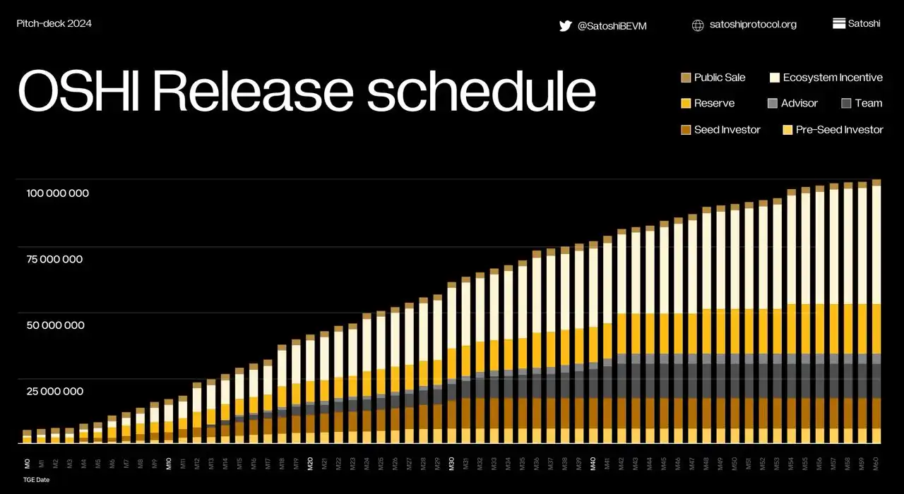 OSHI 总供应量上限为 100,000,000 枚,代币采取线性解锁的方式以支持 Satoshi Protocol 长期可持续的发展。持有并质押 OSHI 将可参与协议收入的分配。