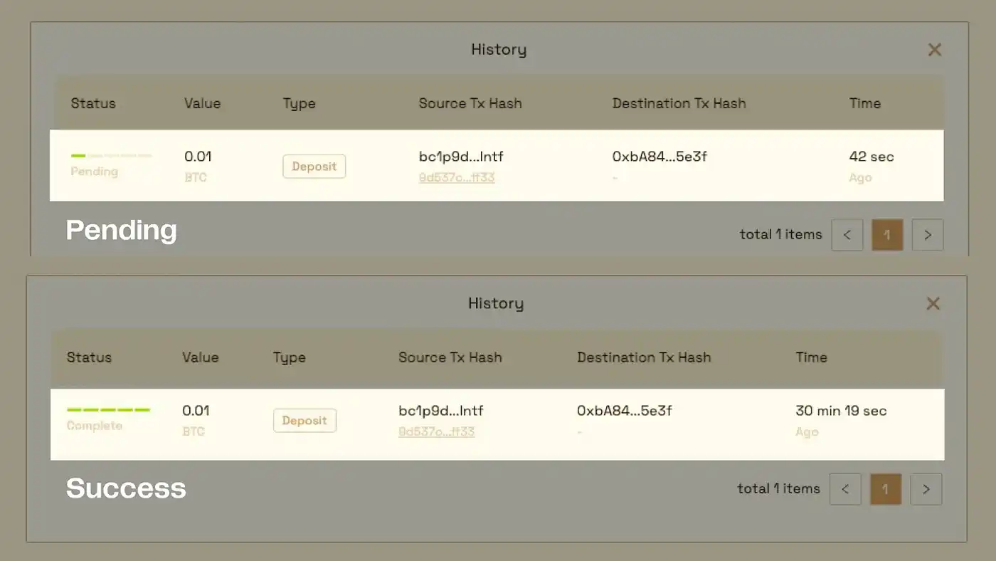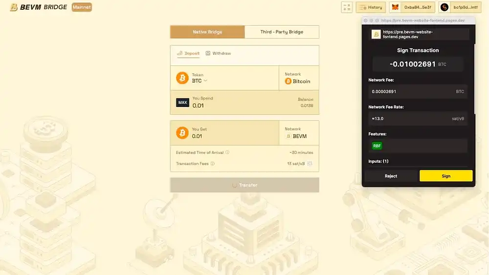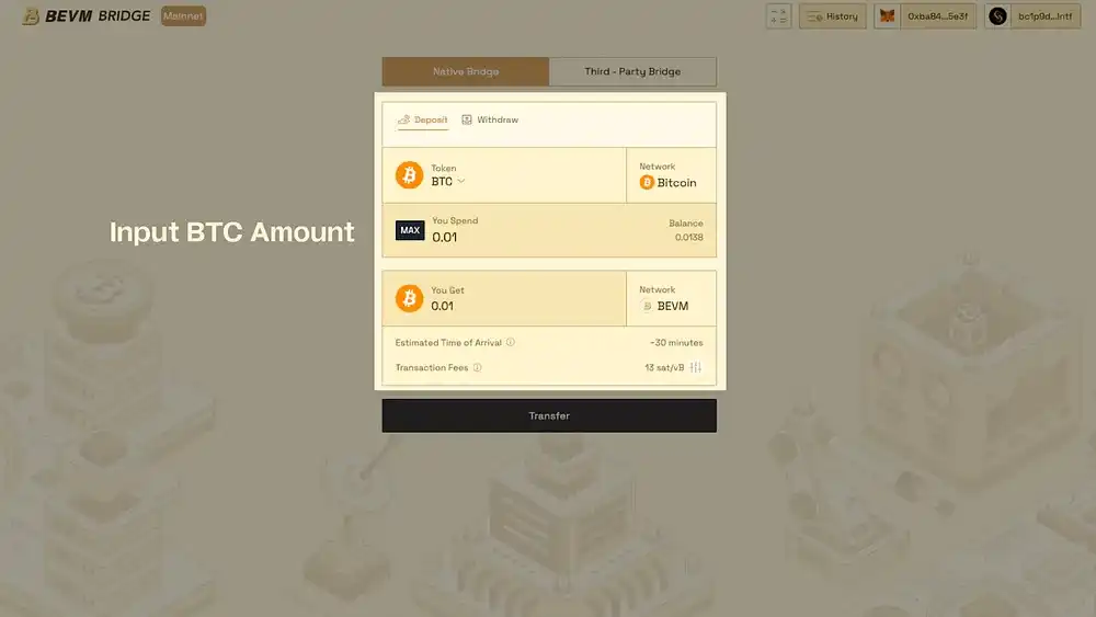 4. 输入准备跨链的 BTC 数量 → 点击 Transfer → 完成跨链(跨链过程)