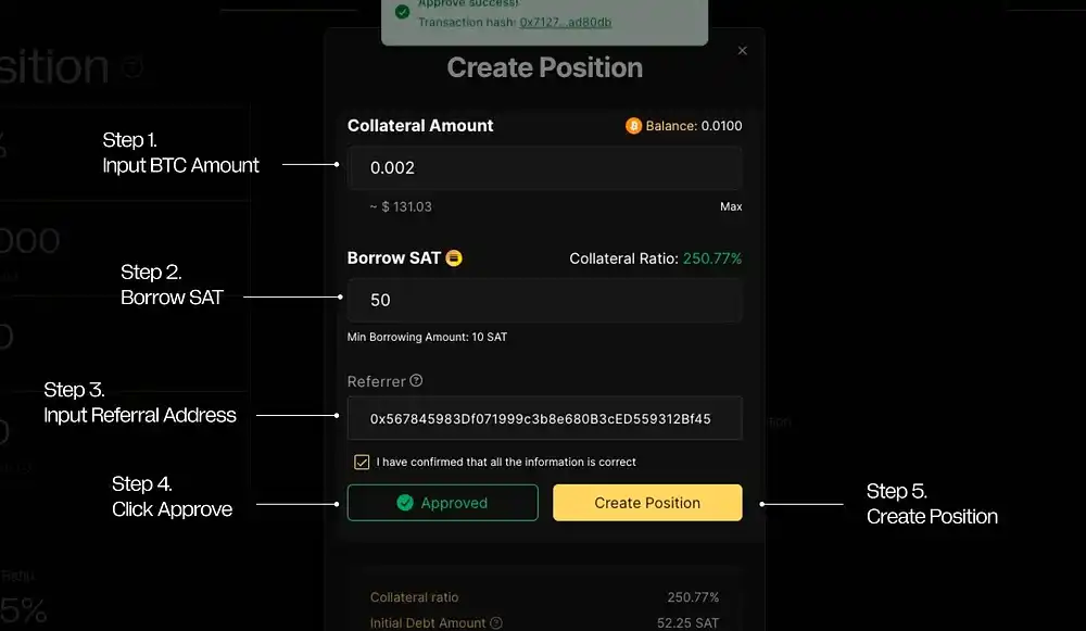 3. 存入 BTC 并借出 SAT—确保抵押率(Collateral Ratio)高于 110% 并至少借出 10 SAT