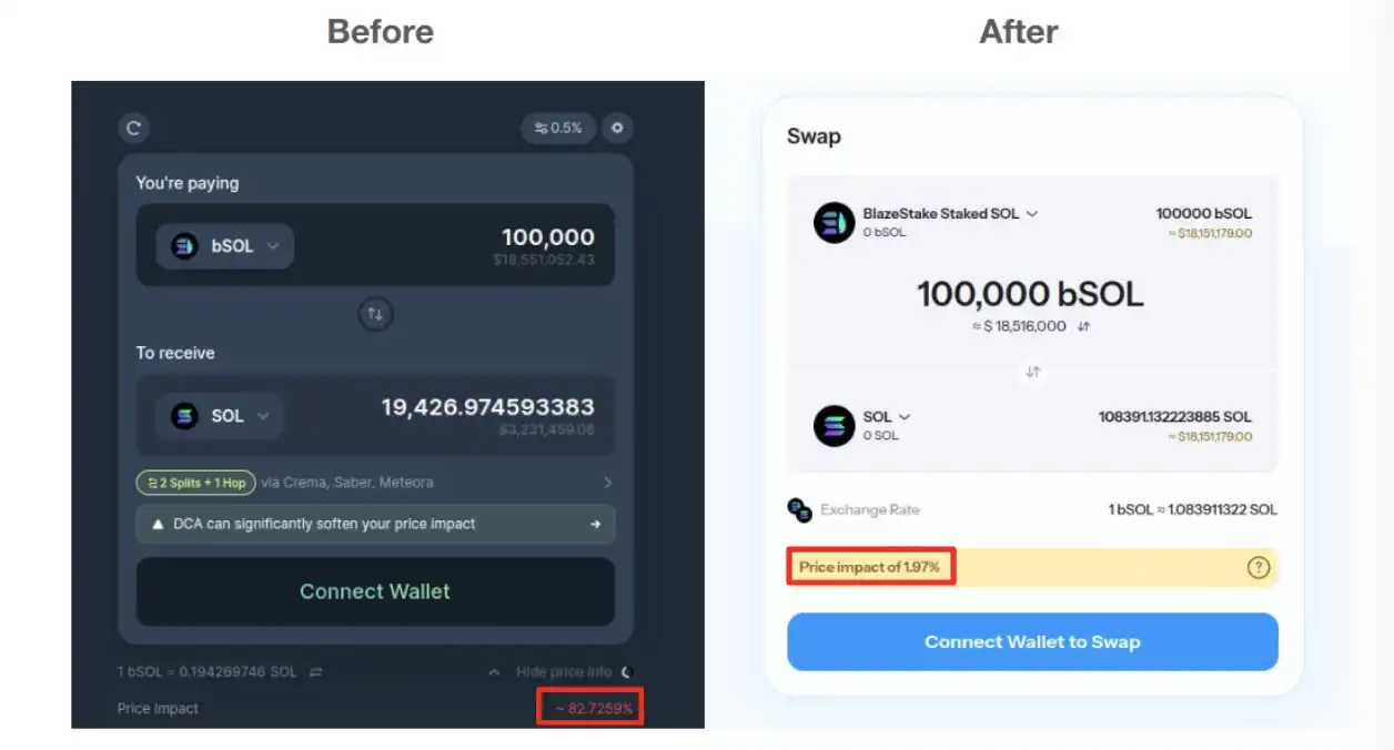 流动性不足时,你的利益也会受损。下图是一个例子,在一个不好的流动池中,将 LST(bSOL)兑换成 SOL 时,如果坚持兑换,会造成 82% 的财产损失。