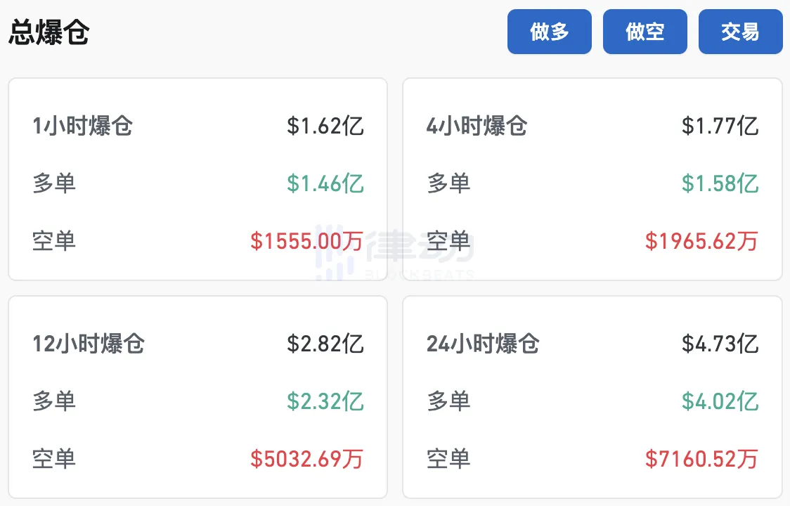据 Coinglass 数据显示,过去 1 小时全网爆仓达 1.62 亿美元,其中多单爆仓 1.46 亿美元。在过去 24 小时全网爆仓 4.73 亿美元中,多单爆仓 4.02 亿美元。