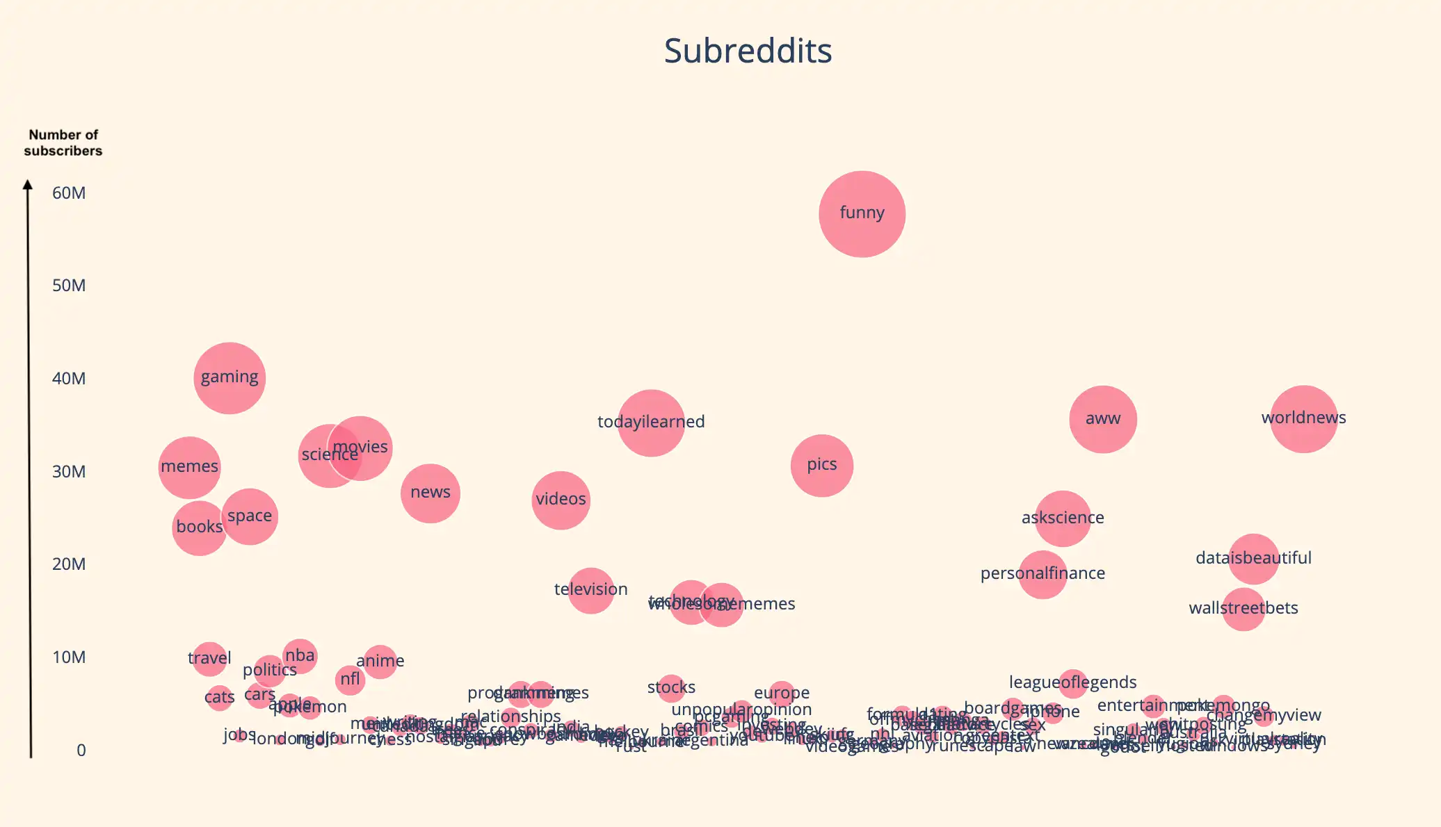 除了 funny 高于其他所有子论坛之外,您可以看到广泛的通用主题范围,所有这些主题都拥有 2000 万至 3000 万的订阅者,其中许多人是在加入 Reddit 时被自动订阅的。