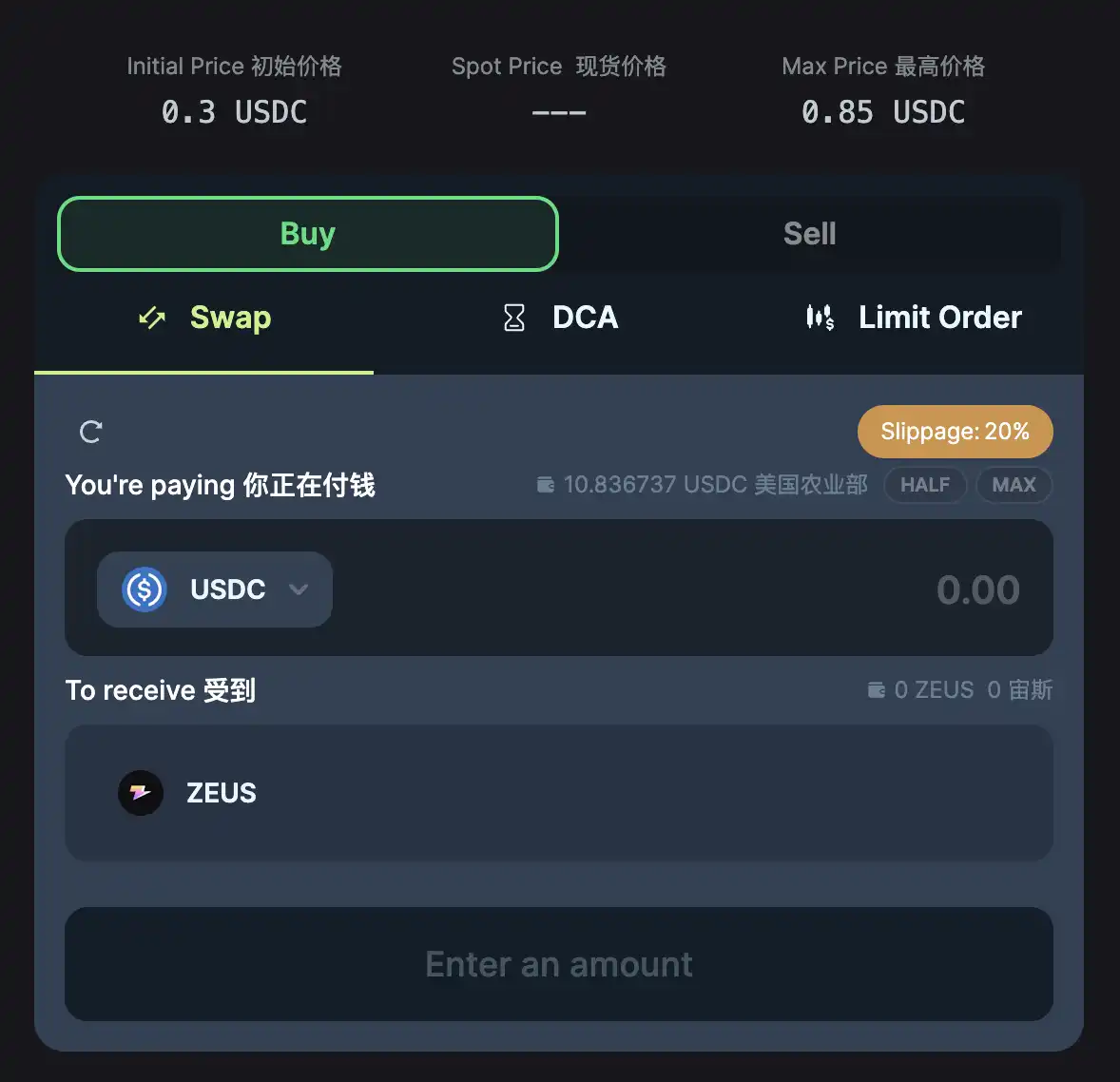 提前预设限价订单或 DCA,以便在启动时获取代币。新代币波动较大,交易时设置最高价格限制。该代币的初始价格为 0.3 USDC。