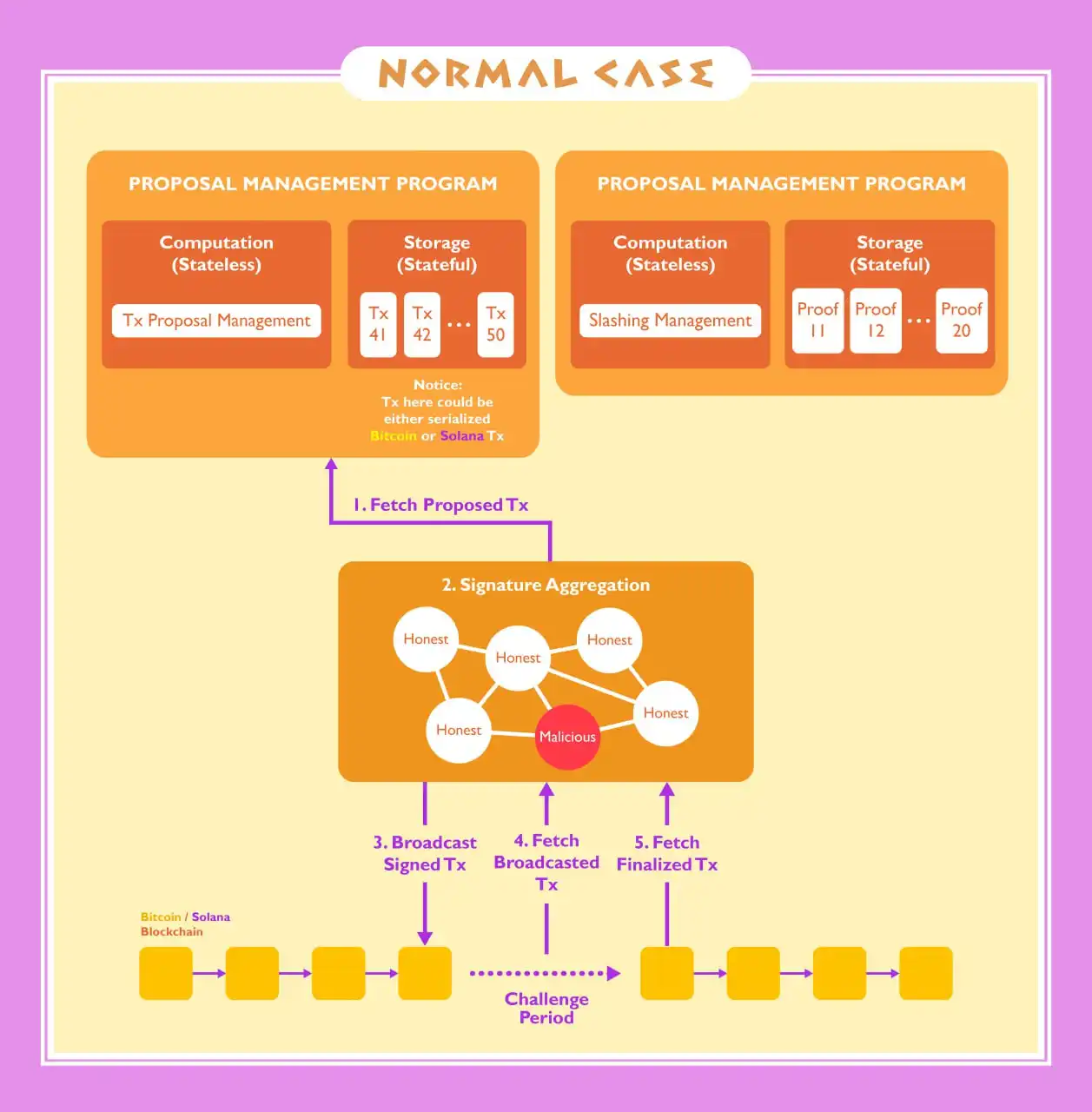 在设想的协议工作流程中,序列化的比特币和 Solana 交易系统地存储在提案管理程序中。然后验证者从 Solana 区块链中检索这些提议的交易。