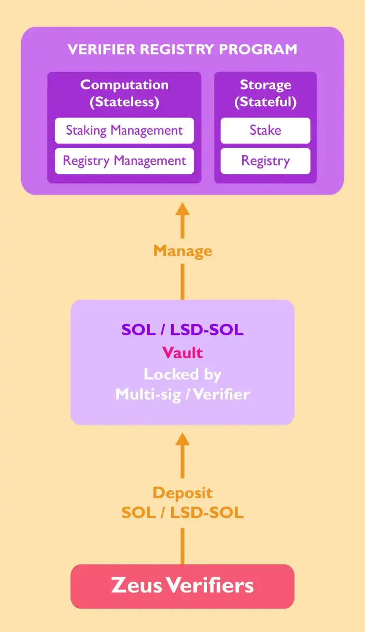 Zeus 网络内的验证过程在去中心化且无需许可的团体模型上运行,与联合公证系统不同。要成为验证者,个人需要运行节点,这是维护私钥和签名功能的必要条件。此外,该过程涉及质押 SOL 或 LSD-SOL,优先使用 LSD,以使质押者能够为权益证明 (PoS) 共识和双向挂钩 (2WP) 机制做出贡献。质押者还需要在验证者注册计划上注册。安全框架依赖于超额抵押设计,通过财务削减措施解决潜在漏洞,增强验证系统的稳健性和弹性。