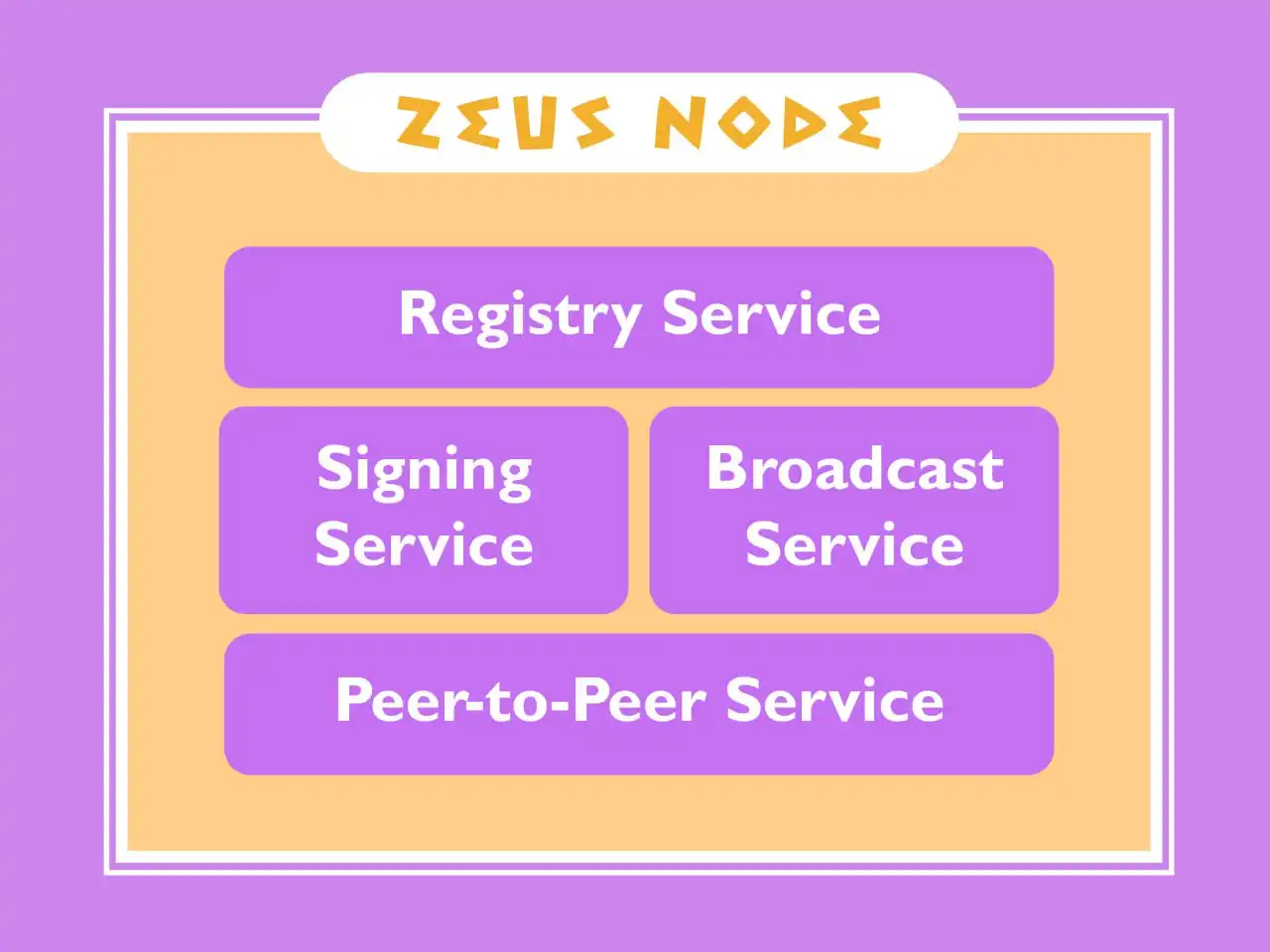 Zeus 节点系统由几个完整的组件组成,包括点对点、广播、签名(具有签名聚合)等链下服务,以及可在链上和链下运行的双功能注册服务。