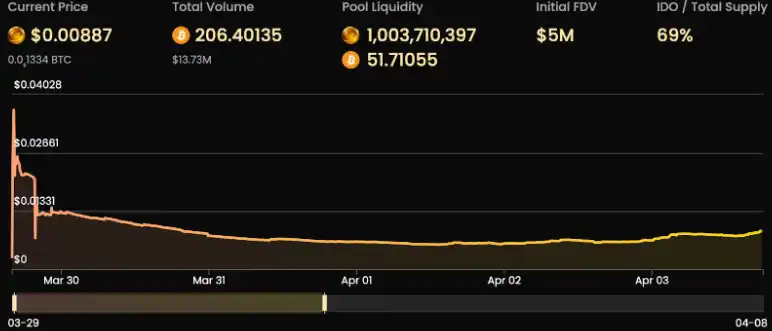 在开启后的一波 FOMO 下,价格从预设的 0.0024 美元(500 万 FDV)飙升至了 0.0364 美元,并逐渐回落到预设的曲线价格。经过四天的发酵后,价格看似企稳在了 0.006-0.008 美元区间,但考虑到比特币跳水的影响,比特币计价的 MDBL 价格事实上出现了进一步上升。