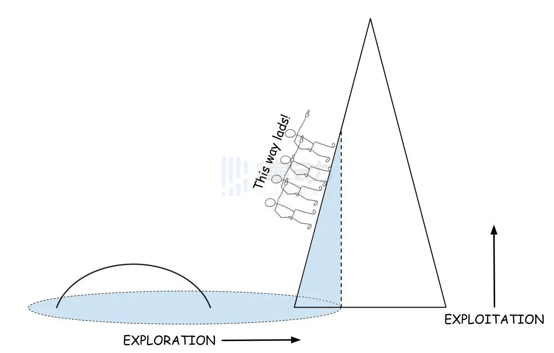 让我们简要讨论探索/开发的博弈论。加密货币周期有两个阶段,一个阶段是人们被迫提出看似新颖的事物,另一个阶段是人们利用这些新事物,并夸大叙事来进行开发。