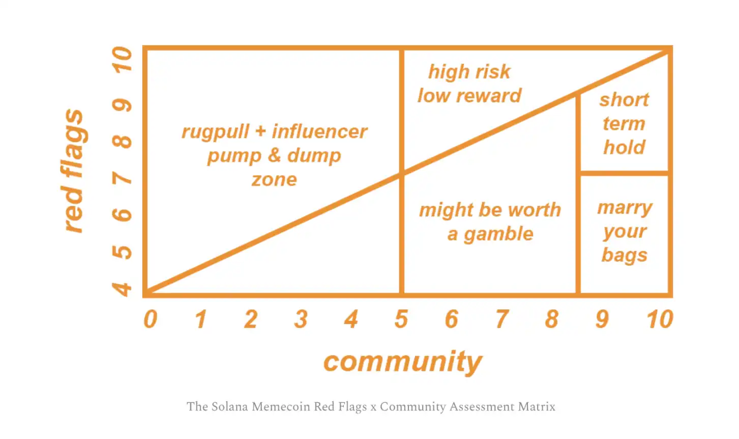 如果你想知道为什么「危险信号」轴从 4 开始,答案是:Solana 上没有危险信号的 Memecoin 根本不存在。通过建立社区排名与存在的负面因素数量之间的比率,我们可以将每个代币松散地分配到一个类别中。