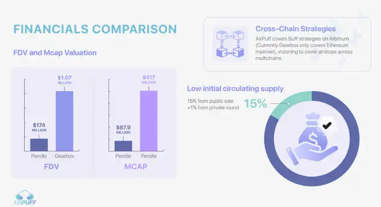 比较市场上类似的协议如 Gearbox 和 Pendle,他们二者的全稀释估值分别为 1.74 亿和 10.7 亿美元,市值则为 8700 万和 4.17 亿。我们估计 AirPuff 的估值会落在两者之间。协议的低起始流动流动供应量(15% 的公售和 1% 的私募轮)也为代币增添更强的上升潜力。