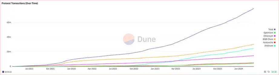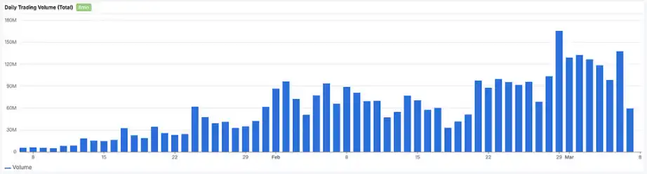 在 Pendle 协议上的交易笔数、交易量也呈现非常正向的逐渐增高,这意味着市场随着 LSD、LSDFI、LRT、Restaking 等 DEFI 项目的发展,市场对于利率衍生品的需求逐渐增加。并且截止于 2024 年 3 月 7 日,其累计交易量也突破 40 亿美元,并且其趋势是逐渐增多。
